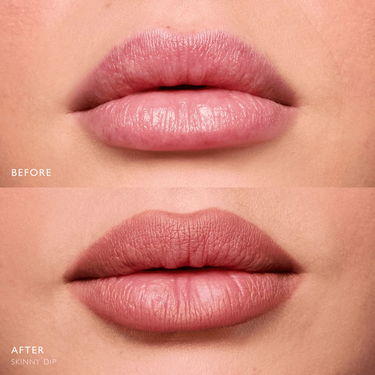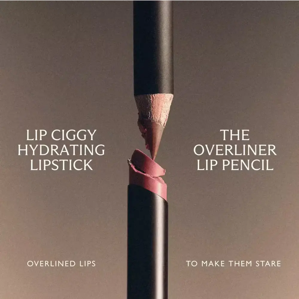 Trace the Overliner Lip Pencil along your natural lip shape, starting at the outer corners and moving toward the center. Draw outside the line of the cupid’s bow to enhance and lift, and overline the center of the lower lip for a fuller pout.