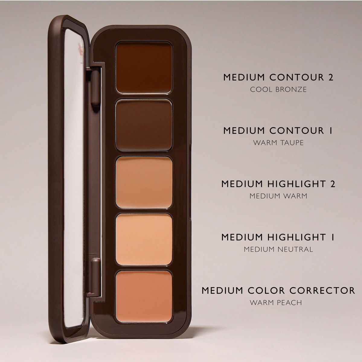 Everything you need to create a seamless, sculpted look in one face palette: 1 color corrector, 2 highlighters, and 2 contours. This blendable, buildable cream formula provides effortless application. Sheer-to-medium coverage creates natural dimension and a second skin finish. Color corrector is perfect for covering dark circles and brightening discoloration. The highlighters help lift and enhance, and the contours sculpt and define your natural features. This was developed to define the structure of your natural features before applying foundation.